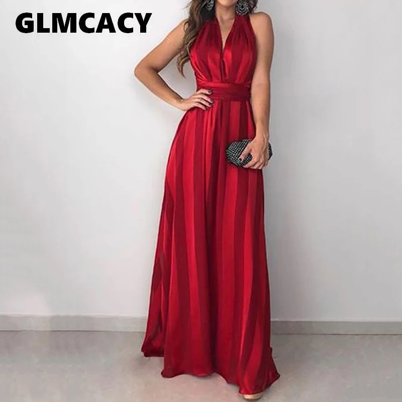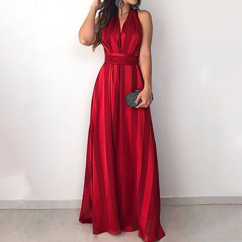 Women V Neck Boho Long Maxi Dresses Evening Party Striped Dress Casual Summer Beach Streetwear Sund
